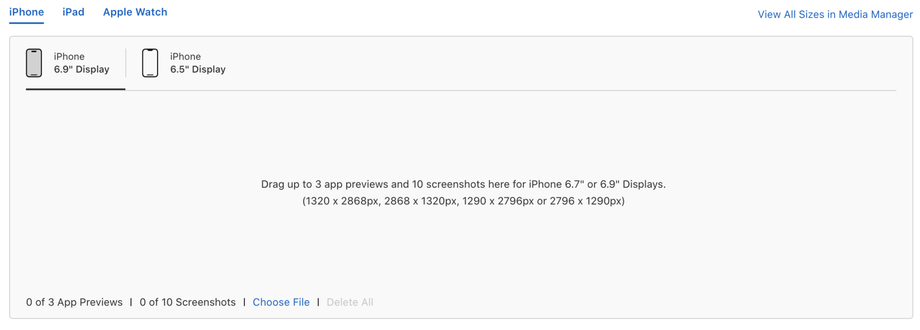 iPhone 6.9" Display | Yes - required if app runs on iPhone. Not required if 6.5" screenshots are provided. | iOS Phones 6.9" or iOS Phones 6.9" (Island) | Aspect Ratio of 19.5:9 Any iOS device which has a ratio of 19.5:9 including all 6.9" devices: iPhone Air iPhone 17 Pro Max | Option 1, 2, 3 or 4 |