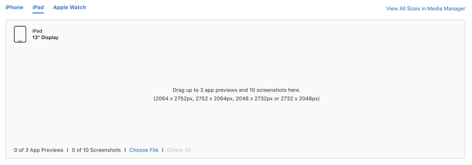 13" Display - iPad | Yes - required if app runs on iPad | iOS iPad - 13" | Aspect Ratio of 4:3 Any iPad or iOS device which has a ratio of 4:3 including all 13" devices: iPad Pro (M5) iPad Pro (M4) | Option 1, 2, 3 or 4 |
