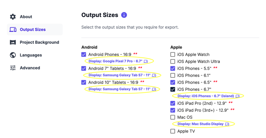 You'll only be able to change recommend customisable Output Devices here. We do not recommend changing the devices pre set for Apple devices besides those suggested, as your app will likely be rejected for using incorrect devices. For Google Play & Android, we recommend selecting the Android device which is easiest for you to obtain your app screenshots for. See a list of all the devices AppScreens has here.