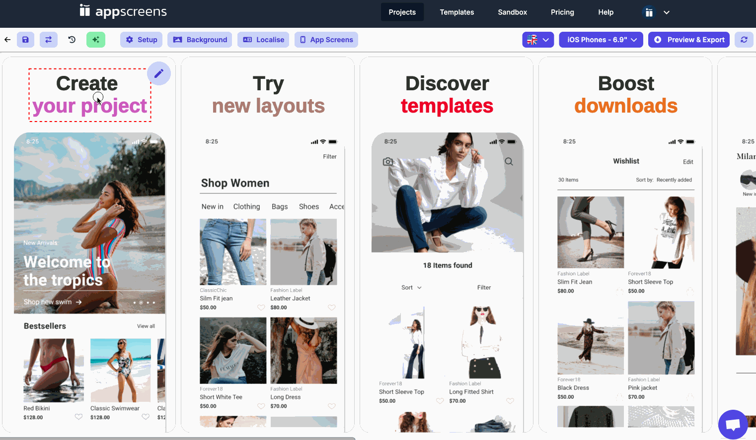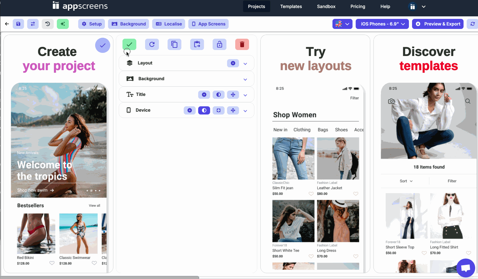 Generally, we want elements to be positioned in the center of our screenshot and not touching the edges! See the width measurements of Full Device – Text Top as an example, where the ‘Title’ Element is 80%