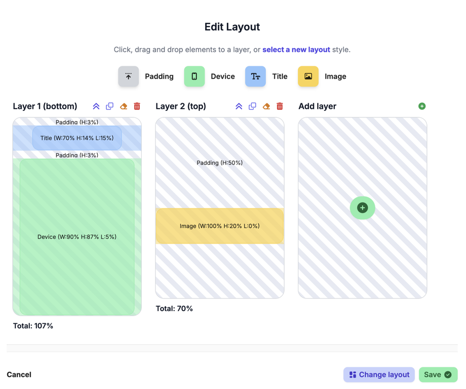 AppScreens offers a range of pre-set layout options but also allows for an unlimited amount of customisation across five stackable layers.
