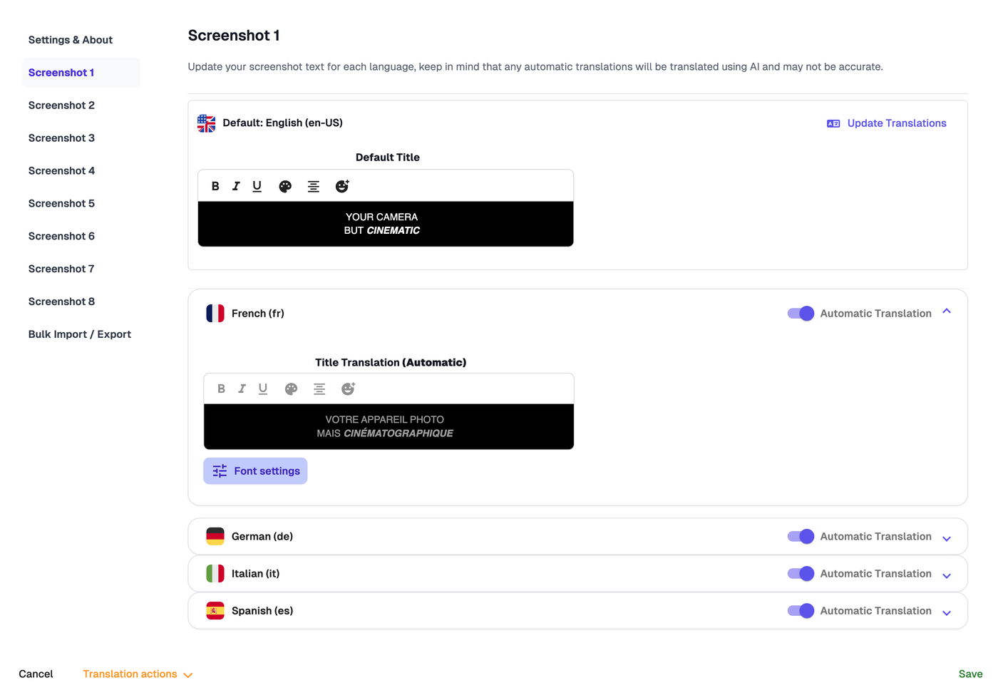 For each screenshot, you can chose to have automatic translation or manually add the translations yourself. To turn on/off automatic translation, click on the Automatic Translation purple toggle. You can enable / disable all by clicking on the Translation actions dropdown in the bottom left corner.