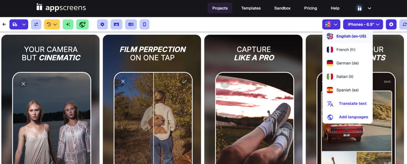 Input your manual expert language translations or have automated translations (powered by AI or Google) for your screenshots in over 80 languages.